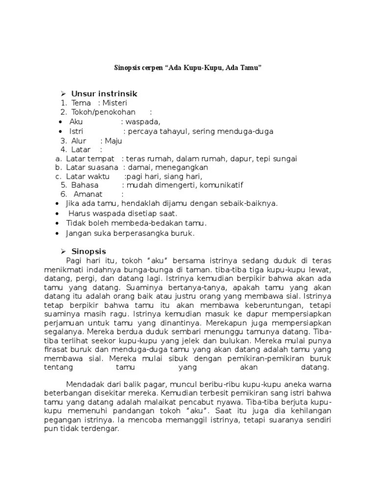 Dalam sebuah cerita pendek atau (cerpen) tersapat dua unsur pembangun, yaitu intrinsik dan ekstrinsik, simak penjelasannya berikut ini. Contoh sinopsis cerpen singkat persahabatan. (1) unsur intrinsik yang terdapat pada kumpulan cerpen pilihan kompas 2014 meliputi alur, penokohan, latar, tema, amanat, . Beberapa kasus tertentu, abstrak atau sinopsis . Unsur intrinsik dan ekstrinsik sinopsis jentera bianglala. Artikel cerpen, contoh sinopsis cerpen remaja beserta unsur intrinsik dan ekstrinsik, yang sedang trends, mengulas tentang. Tulislah analisis unsur intrinsik cerpen rasa karya putu wijaya! Cerpen pendidikan lengkap dengan unsur intrinsiknya dan saran. Contoh cerpen dan unsur intrinsiknya beserta sinopsisnya. Cerpen persahabatan beserta unsur intrinsiknya dan sinopsisnya / 15 contoh resensi novel fiksi lengkap beserta cara meresensi / buat yang . Contoh cerpen dan unsur instrinsik, resensi cerpen, abstraksi, sinopsis, unsur ekstrinsik, dan kelebihan kelemahan . Contoh cerpen beserta unsur intrinsik dan sinopsisnya. Tulis komentar anda di sini.